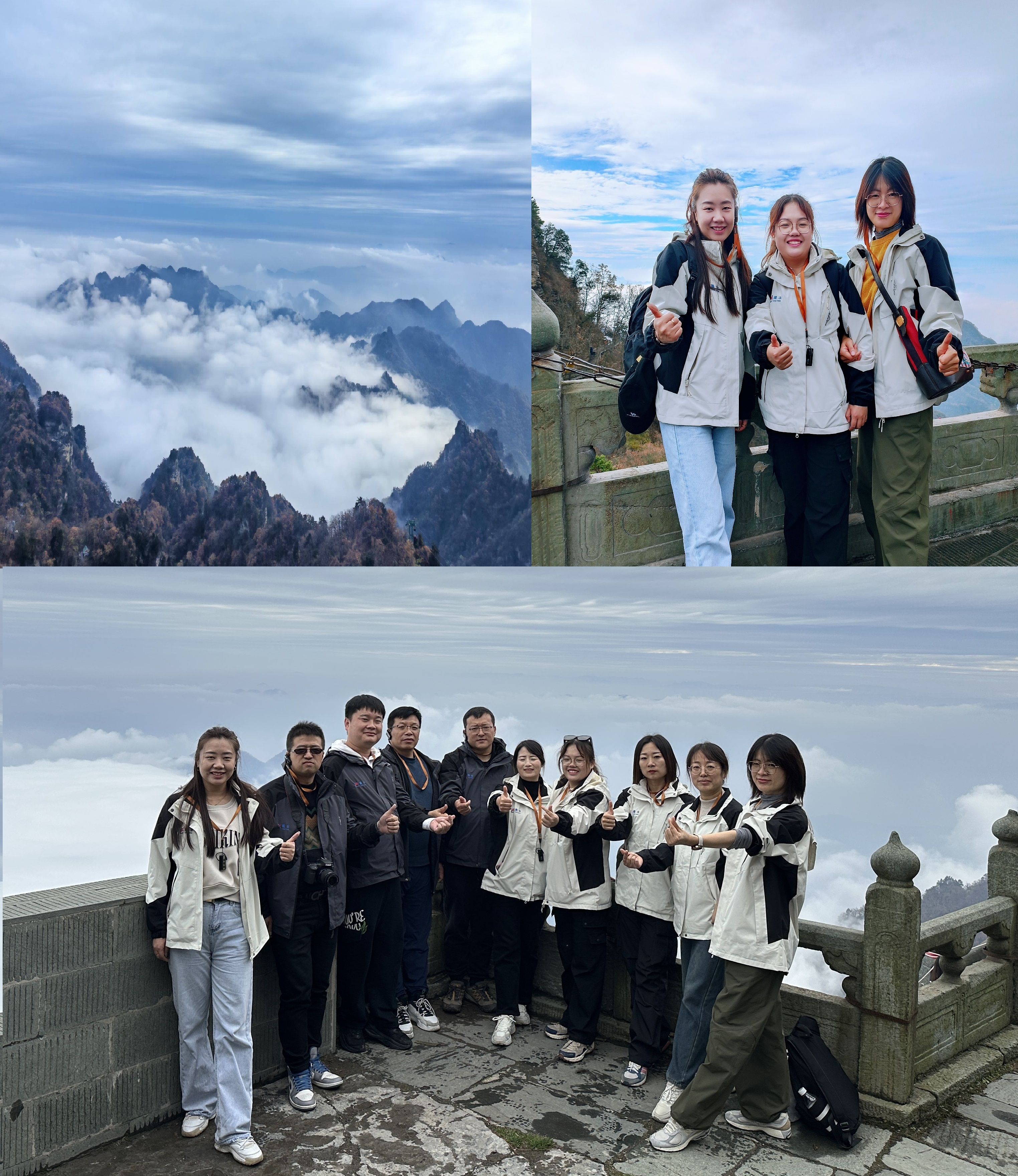 第二天早餐過后,團(tuán)隊(duì)一行人啟程開始向武當(dāng)山進(jìn)發(fā)。武當(dāng)山,這座神秘而古老的道教圣地,以其秀麗的自然風(fēng)光、深厚的文化底蘊(yùn)而聲名遠(yuǎn)播。初入武當(dāng),大家便被這雄偉壯觀的自然景色和人文景觀所震撼。懷著興奮于期待的心情從南巖出發(fā),向著主峰金頂前進(jìn),抬頭望去,巍峨的山峰直插云霄,大家身著運(yùn)動(dòng)裝備,迎接著這場(chǎng)體力與意志力的考驗(yàn),開始大家伴隨著周圍的美景輕松的走著,清新的空氣讓人心曠神怡,然而隨著臺(tái)階高度的不斷提升,山路變得陡峭起來,大家不畏困難互相攙扶、互相鼓勵(lì),終于到達(dá)了山頂,再次俯瞰腳下的美景,彼此心中充滿了成就感,金頂?shù)南伸F繚繞讓人置身于仙境當(dāng)中,此時(shí)大家忘記了疲憊,盡情享受著登頂后勝利的喜悅。